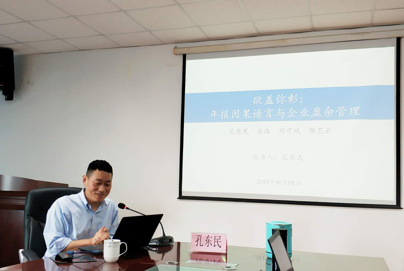 2019年6月10日上午,孔东民教授应邀到公司开展学术交流与指导,并做客永利集团304am官方入口2019第13期“经济学名家讲堂”,为师生做了《欲盖弥彰:年报因果语言与企业盈余管理》的精彩学术报告。
