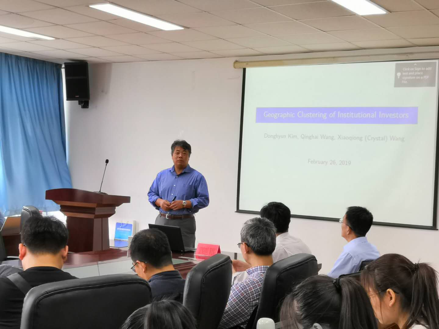 2019年6月14日上午,QINGHAI WANG教授应邀到公司开展学术交流与指导,并做客永利集团304am官方入口2019第15期“经济学名家讲堂”,为师生做了《Geographic Clustering of Institutional Investors》的精彩学术报告。