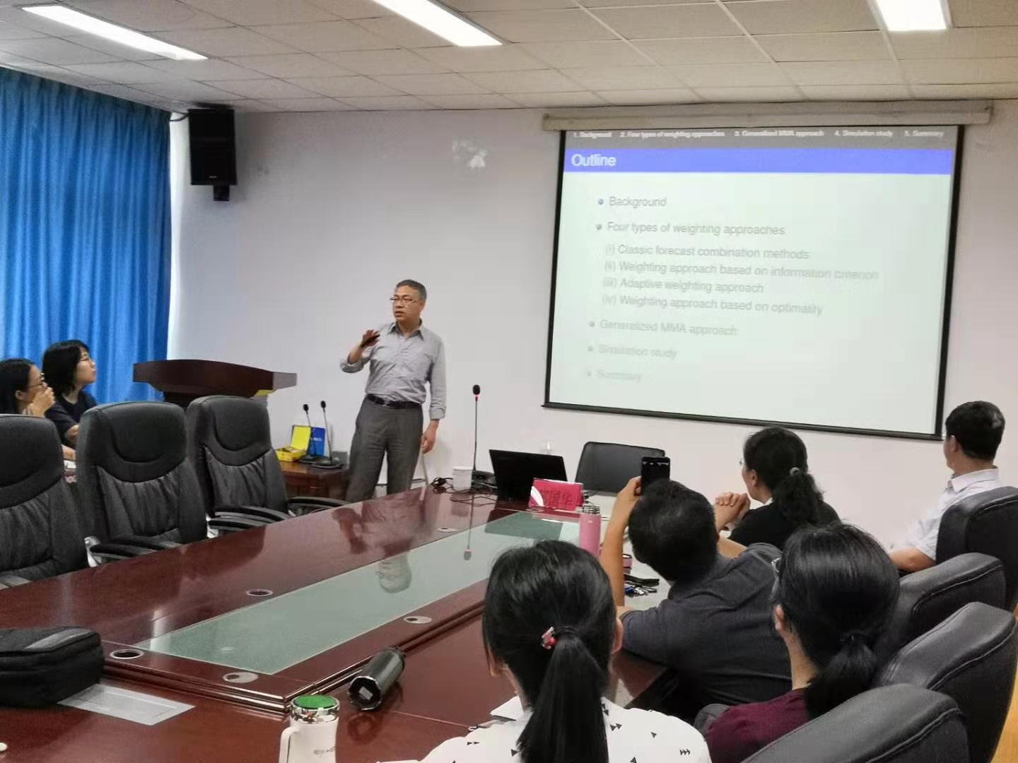 7月4日上午,首都师范大学特聘教授、统计学专家邹国华教授应邀做客永利集团304am官方入口2019年第18期“经济学名家讲堂”,为全院师生开设 “具有发散参数个数的时间序列模型的平均预测”的专题讲座。邹国华教授从研究背景出发,介绍了模型平均中常用的四种选择权重的方法,进一步提出了用于选择权重的广义Mallows模型平均(GMMA)方法,并从理论、仿真实验与实例分析等方面解释了GMMA方法的预测精度问题。邹国华教授以缜密的理论推导、详实的证明资料为大家呈现了前沿的学术研究进展。