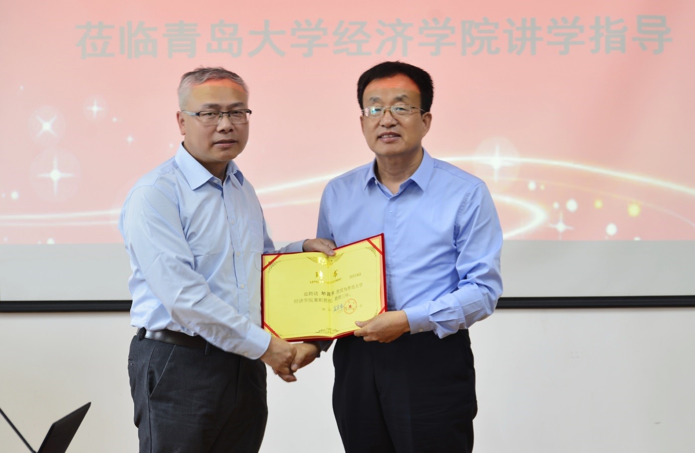 2021年5月31日下午,永利集团304am官方入口在金家岭校区举行了兼职教授聘任仪式,首都师范大学邹国华教授受聘为永利集团304am官方入口兼职教授,永利集团304am官方入口刘喜华经理为邹国华教授颁发了聘书。聘任仪式结束后,邹教授做客永利集团304am官方入口“经济学名家讲堂”,为全院师生做了《Model averaging estimation for probability density functions》的精彩学术报告,讲座由陈东景副经理主持。
